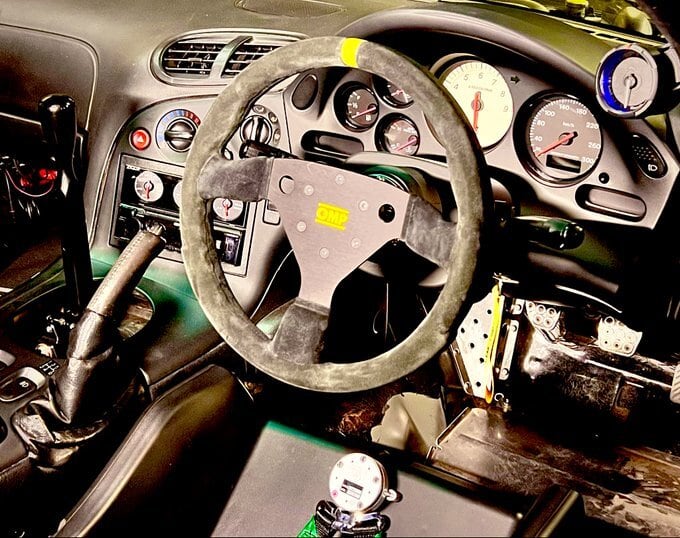 320 Alu S - Three spokes flat aluminium steering wheel in suede leather. Shaped handgrip and spokes to improve driving feeling and comfort. Two red buttons mounted on horizontal spokes controlling two separate accessory switches (for example one for horn and the other for highbeams).