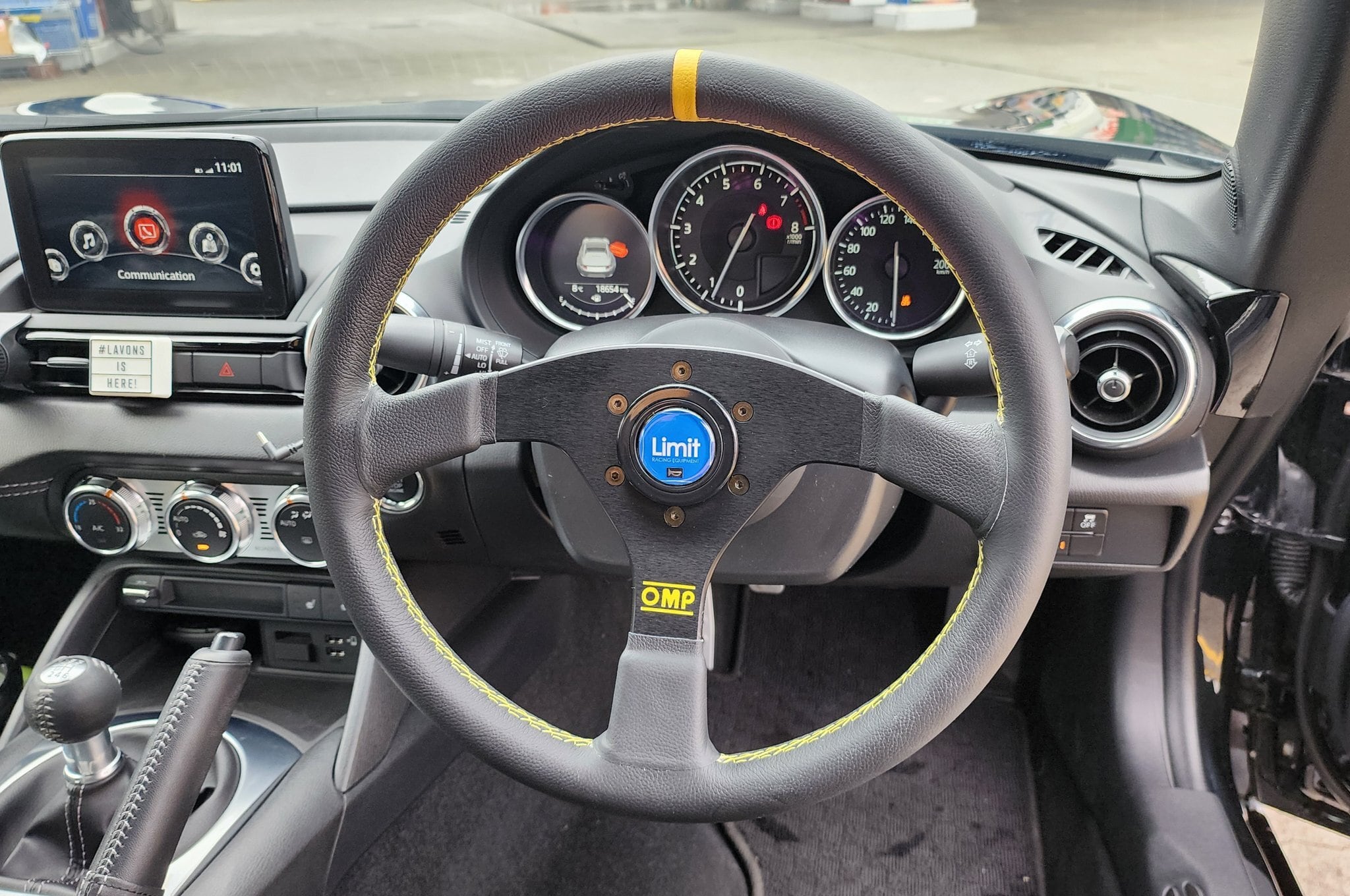 VELOCITA': Flat steering wheel, in smooth leather with 3 black anodized aluminium spokes. Supplied with horn button. Yellow stitching.