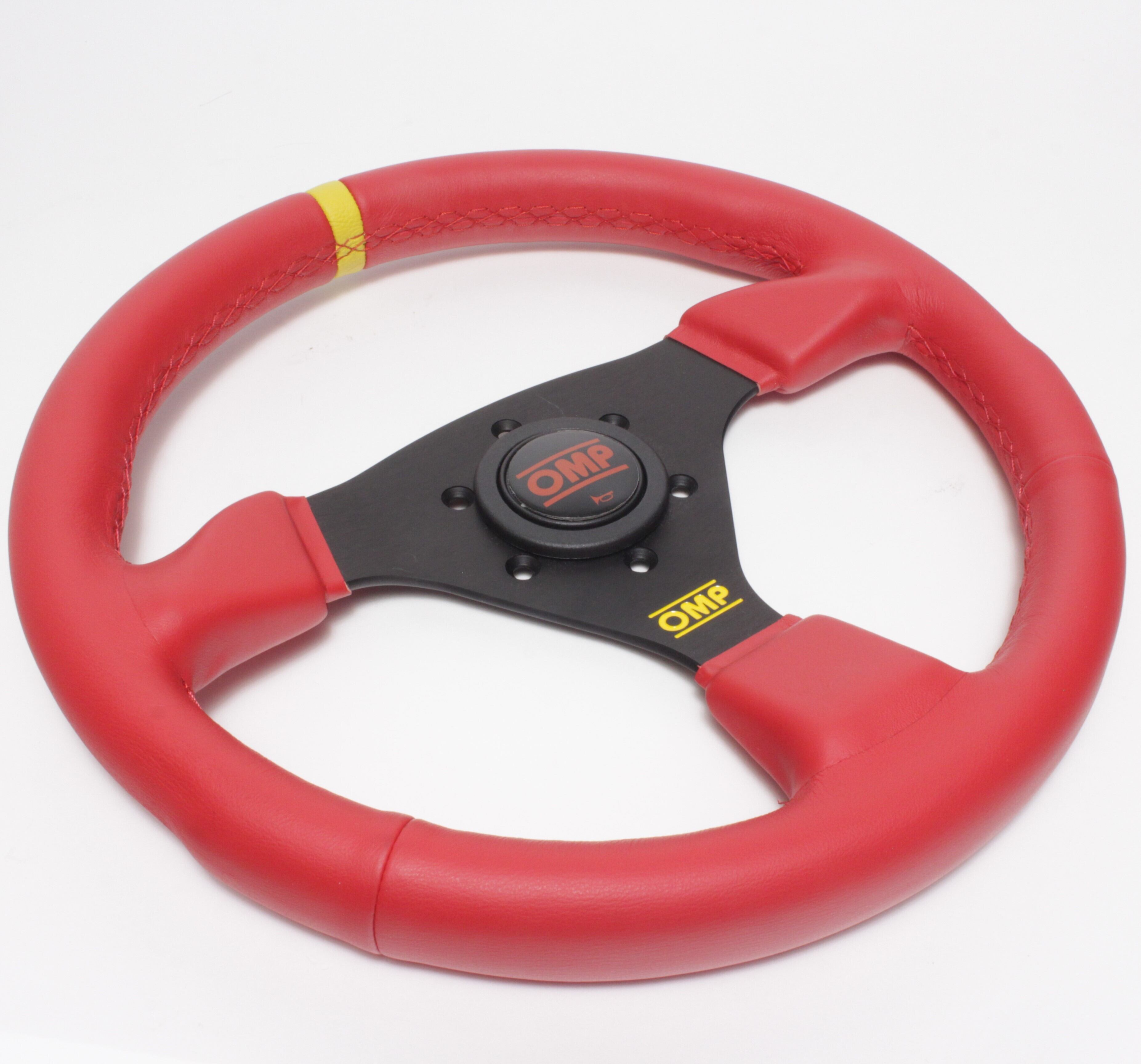 TARGA 330: Flat steering wheel, in smooth leather, with 3 black anodized spokes. Supplied with horn button. Red stitching.